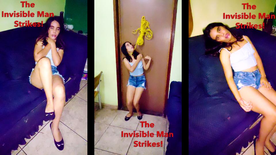123: Maria has been stalked home by the Invisible Strangler and is mercilessly tormented throughout her living room! Just as she hangs up her phone, the Strangler makes his move and crushes the poor girl’s neck! This one is a fighter and she tries to kick and push the invisible attacker away. He shoves her in a chair and hangs tight to her neck before letting her go. Feeding on the fear of the terrified and crying girl. He pushes her down on the floor next to the couch, the drags her up against the door next to some conveniently placed rope. She strangles at the door for a time, desperately trying to get free. The strangler enjoys her fear as much as the struggle… He releases her from the rope before continuing to torture and torment Maria on the floor and the couch! As the pressure continues to be unrelenting, saliva foams out of her mouth and spills down her chin. Soon her life fades away and she dies on the couch with her tongue sticking out and eyes open.