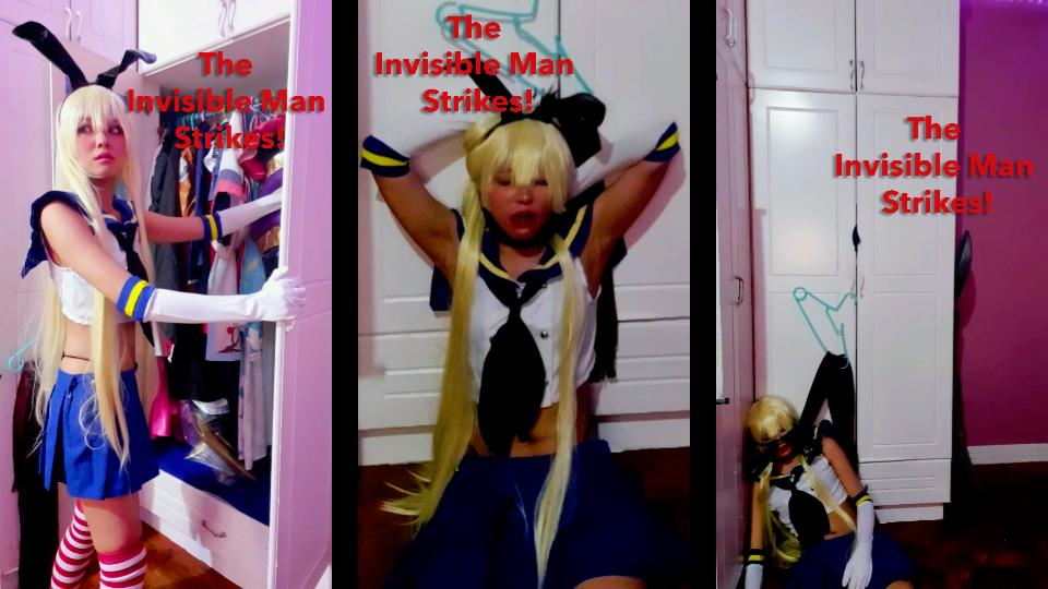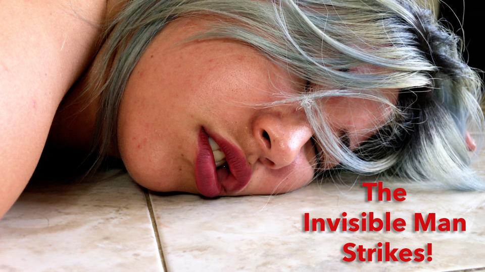 137: Reina is trying on her costume outfit near the closet when she feels a strange force… The Invisible Strangler has been watching and brushes past her. The frightened girl is pushed to the ground against the closet. The Strangler takes a scarf hanging from the closet and wraps it tight around Reina’s slender throat! Her face goes red from the crushing force as the scarf squeezes the breath out of her. She fights against the pressure, wiggling on the floor and sticking out her tongue while her blond wig bounces. The killing force overwhelms and Reina falls dead limp in the corner