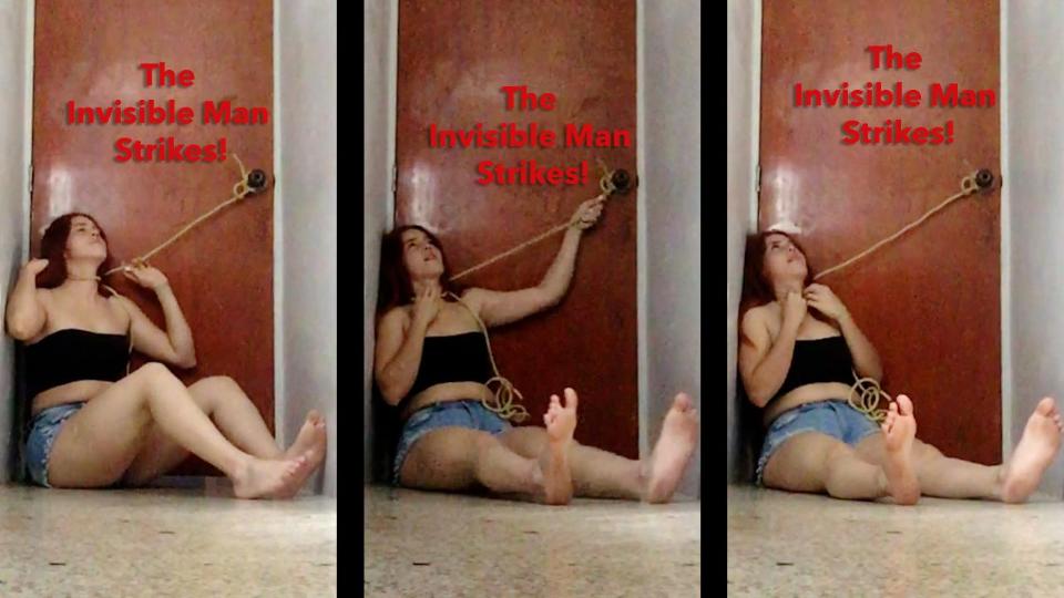 162: Nina’s mind has been taken over by the Invisible Strangler and she is now despondent, ready to end it all. She ties a rope around the handle of the door and then stretches back against the corner. Her bare feet slide across the cold hard ground as she leans in to her final pose. The rope goes taught and Nina strangles against it bitterly. Her bare feet kicking and stretching, arms holding at the killing rope as the life is strangled out of her. Nina’s body fights against death but it is too late. The rope constricts her throat and strangles the life out of her. After some time, she goes limp in the corner, a death stare frozen on her face, she strangled herself there on the floor.