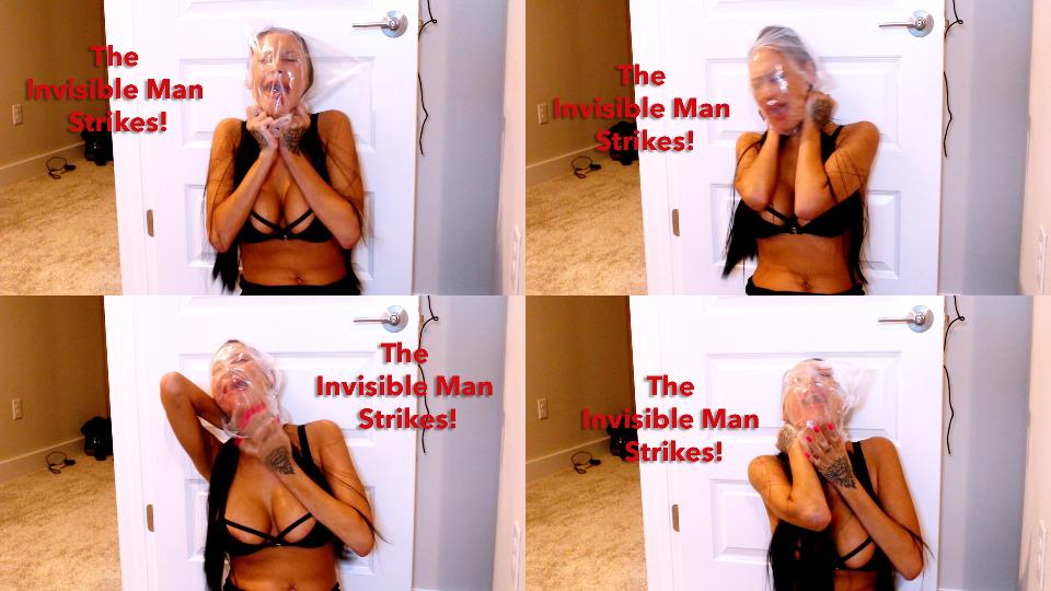 163: Willow has one terrified moment to beg for mercy before the Invisible Strangler forces a plastic bag over her head, suffocating her slowly! She cries and moans as she struggles inside the plastic, panic taking over. Willow tries desperately to shake herself free but the more she wants the breath the tighter the plastic seems to smother her. Willow shakes and cries out as she feels her life slipping away. Her chest bouncing and hair waving as she shakes back and forth in an attempt at freedom. The Invisible Strangler has no mercy and holds the bag around her face all the tighter, suffocating the woman in her own home. Willow gives a mighty struggle but it is not enough to free her face from the killing plastic and soon she is completely breathless. With no oxygen, she fades away and goes limp against the door, the plastic still wrapped tight around her in death.
