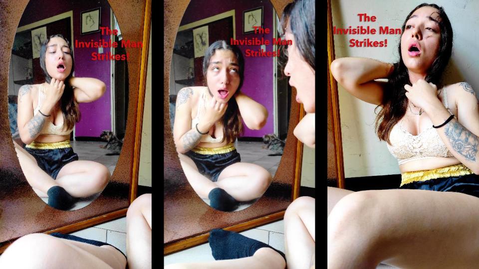 164: Olivia sits at her mirror and brushes her long luscious hair while getting ready for her day in a crop top and shorts. Little does she know that the Invisible Strangler is there watching her and is going to use Olivia’s own long hair to do her in! The hair wraps around her slender throat and squeezes it tight. Olivia gasps in surprise as her hair chokes her senseless. She struggles and whimpers, eyes rolling and mouth gasping desperate for air. Olivia watches herself in the mirror as she is ruthlessly strangled, head shaking as she works uselessly to free herself from the clutches of the Invisible Strangler. Olivia is finished off against the wall, going limp with her tongue hanging out and eyes staring in the distance as her body sporadically twitches in death.