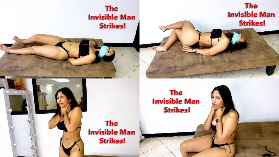 Anna awakens in a fright, tied up bound by the Invisible Strangler! Her hands tied behind her back and a cloth wrapped tight around her mouth to keep her quiet. Left on a couch in just a bikini, Anna has never felt more vulnerable and exposed… She struggles against her bindings and calls out from behind the gag as she wiggles to get free. Kicking her bare feet and turning this way and that in terror. Eventually Anna is able to get her hands free and quickly removes the gag and tries to leave. But the Invisible Strangler has been watching her close! He takes his chance to strike and lashes out at Anna, wrapping his hands tight around her delicate throat. Anna gasps in terror as she is strangled. Moving around the room trying to get free, gagging and coughing from the crushing pressure. She is brought onto the couch where her struggle for life continues, trying to stand and escape but forces back down as she cries out in agony. After a relentless struggle the Strangler conquers his victim and she falls back dead on the musty couch with her eyes frozen open.
