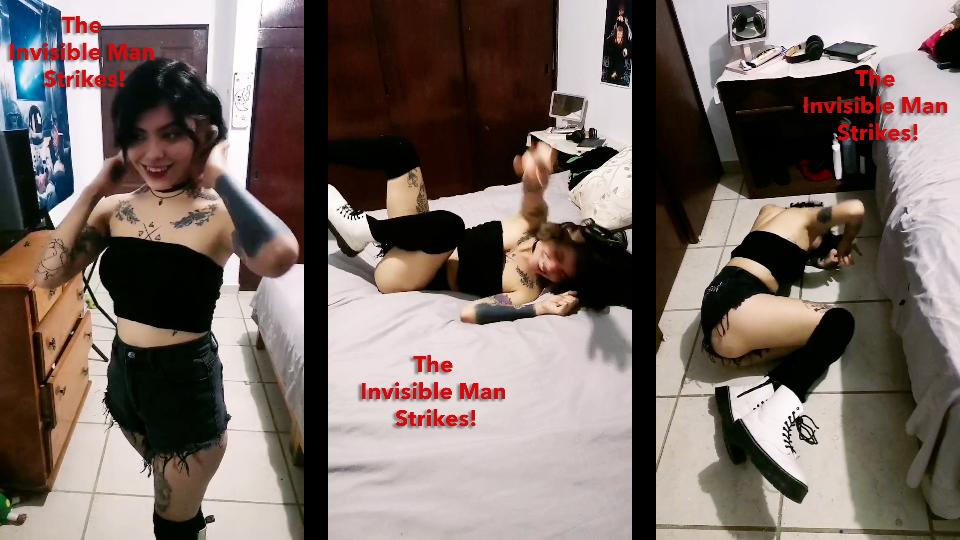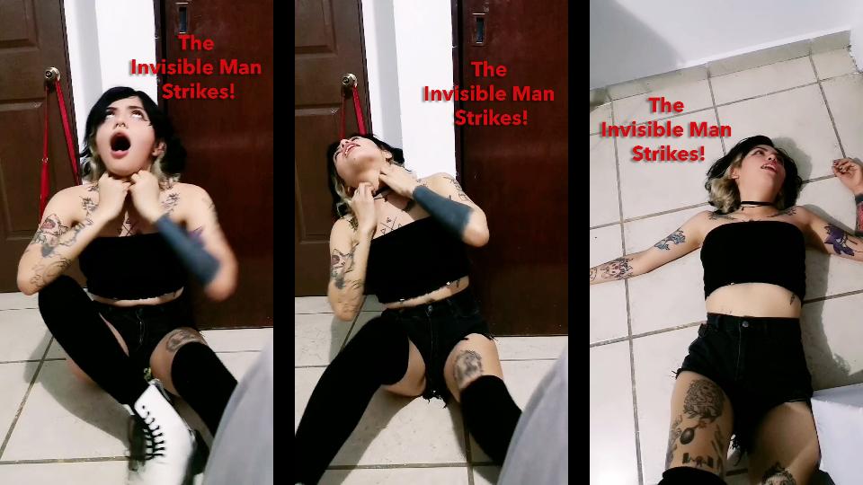 Laura checks herself out in the mirror in her bedroom while wearing a crop top and short shorts. The tattooed girl smiles in the mirror then crosses over to her bed and picks up a book for some reading. She doesn’t get far before the book is suddenly thrown from her hands! Laura is frightened and surprised, unaware of what the Invisible Strangler has in store for her. Suddenly she is attacked, thrown onto the bed and assaulted as she bounces up and down on the mattress flailing her arms. Laura is thrown off the bed face down on the floor where she struggles further before getting a chance to stand up. Laura steps through her room in an attempt to escape, but the Strangler roughly pushes her against the wall with the intent of finishing her off for good, The tattooed girl gasps and struggles as she is choked out against the wall. She slides down onto the floor and kicks her feet in desperation, attempting to break free from the killing force. Laura shakes her head and spasms as the strangling pressure overwhelms and then she falls back onto the cold ground. Smacking her arms weakly at the air, grasping for her attacker in her final moments. Then Laura goes limp and her arms crumple to the floor and she goes still, dead on the ground.