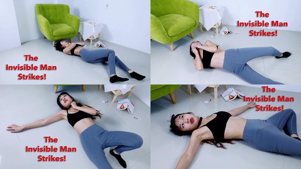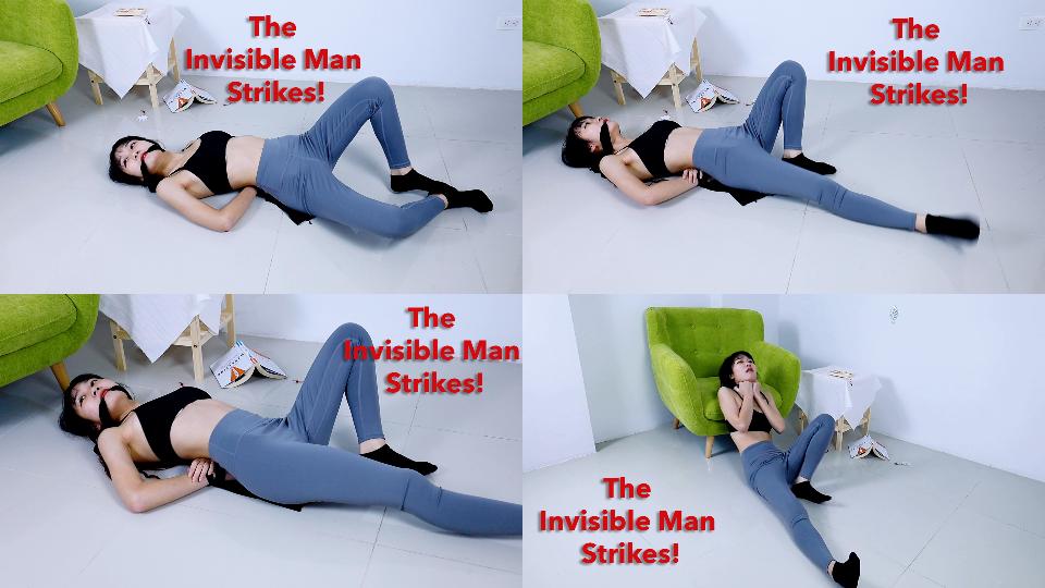 Helen wakes up on the floor of her apartment bound and gagged, kidnapped by the Invisible Strangler! She struggles on the floor helplessly as she calls out from behind the cleave gag. Helen manages to break free of her bonds, but the Invisible Strangler is close by and wraps the garment tight around her neck as a ligature, choking her relentlessly. Helen gasps and gags from the pressure, kicking her legs out in a desperate attempt to get free of the Stranglers clutches. Her struggle is no use, Helen is strangled with the gag used as the killing ligature until she is dead on the floor.