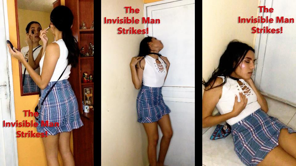196: Barb gets ready for a date with some finishing touches on her makeup. She checks herself out in the mirror feeling satisfied. She wears her purse around her chest and gets ready to leave. But she won’t be making it to her date out… Because the Invisible Strangler is ready to take Barb on a date with death! He pushes and prods at the girl, frightening her gradually before making his presence known. He manhandles the girl into the corner and then wraps the purse strap tight around her neck. Barb struggles in terror, arching her neck and grasping at the strangling purse strap. She is throttled against the wall as she gasps and moans in agony, trying to swat away her Invisible attacker. The purse strap strangles her tight and the asphyxiated girl stands no chance against the Strangler. Barb’s feet fall out from under her and she ends up on the floor against the wall with the purse strap choking her to death. Her hands clutching desperately at the ligature fall limply down her chest and land at her side as Barb dies there on the floor.