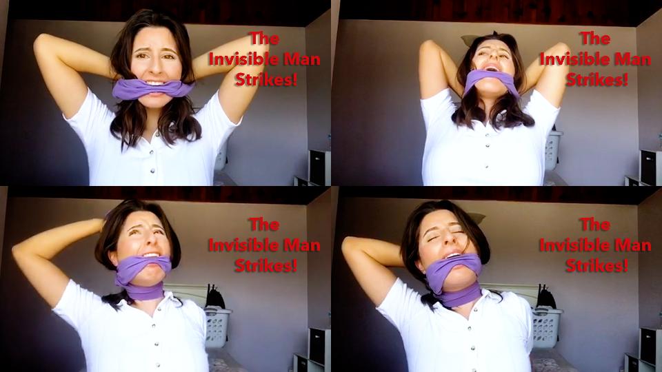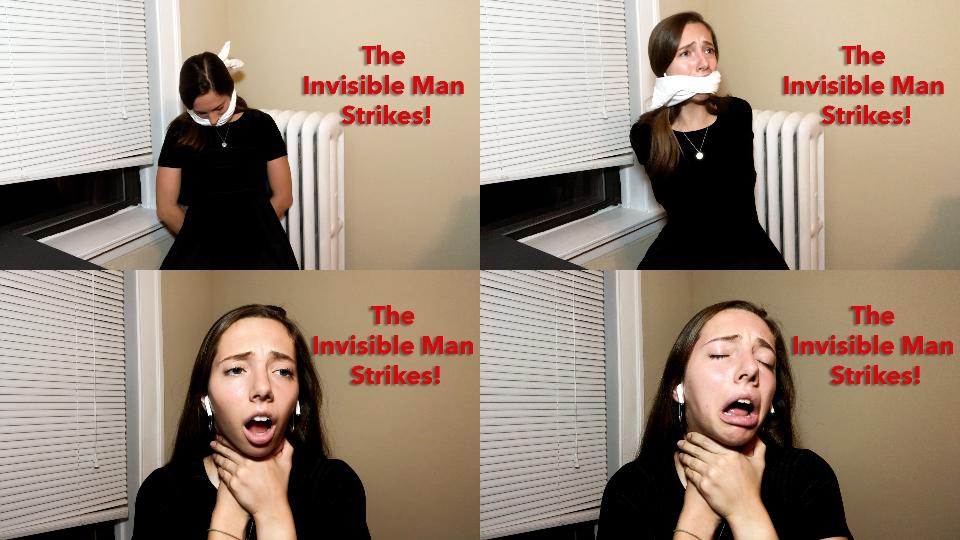199: Heather was getting ready for her choir recital when she was KO’d and kidnapped by the Invisible Strangler! She wakes up, tied up to the radiator in a chair with a cloth gag wrapped around her mouth. Heather looks around in confusion, the terror of the situation gradually becoming apparent to her. She shakes and wriggles in fear, looking for her attacker and crying out muffled pleas for mercy. Hannah curls into a ball best she can as she shrinks into the corner in horror. The Invisible Strangler lets Hannah free in order to make short work of her. Invisible hands wrap their way around the girls tender throat as she gasps in pain. Her eyes roll back and brows knit in pain. Heather’s mouth opens wide as she parts her lips and utters out moans of pain. She shakes her head and clutches at her neck as the Invisible force strangles her into oblivion. Heather goes limp in the chair, another victim of the Invisible Strangler.