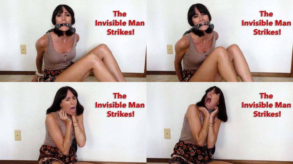 200: Shirley is posed against the wall, bound by the Invisible Strangler. The kidnapped woman looks around the room for her mysterious captor. Her ankles and wrists are tied up and a tie is in her mouth as a cleave gag. Fear builds gradually as Shirley realizes she is not able to get free. She cries out muffled from behind the gag over her mouth. Putting up an energetic struggle in her attempt to get free. She yells out, tearing up in fear at her impending doom. The Invisible Strangler enjoys the struggle then lets her free in order to finish her off for good! Shirley clutches at her throat as the Strangler exerts his pressure on her, crushing her windpipe. Shirley coughs and gags, her tongue sticking out wide as the Killer presses on with murderous force. Shirley shakes in terror, trying to wiggle her way free. But it is no use. The Invisible Strangler makes short work of her and she fades away, becoming a limp corpse against the wall.