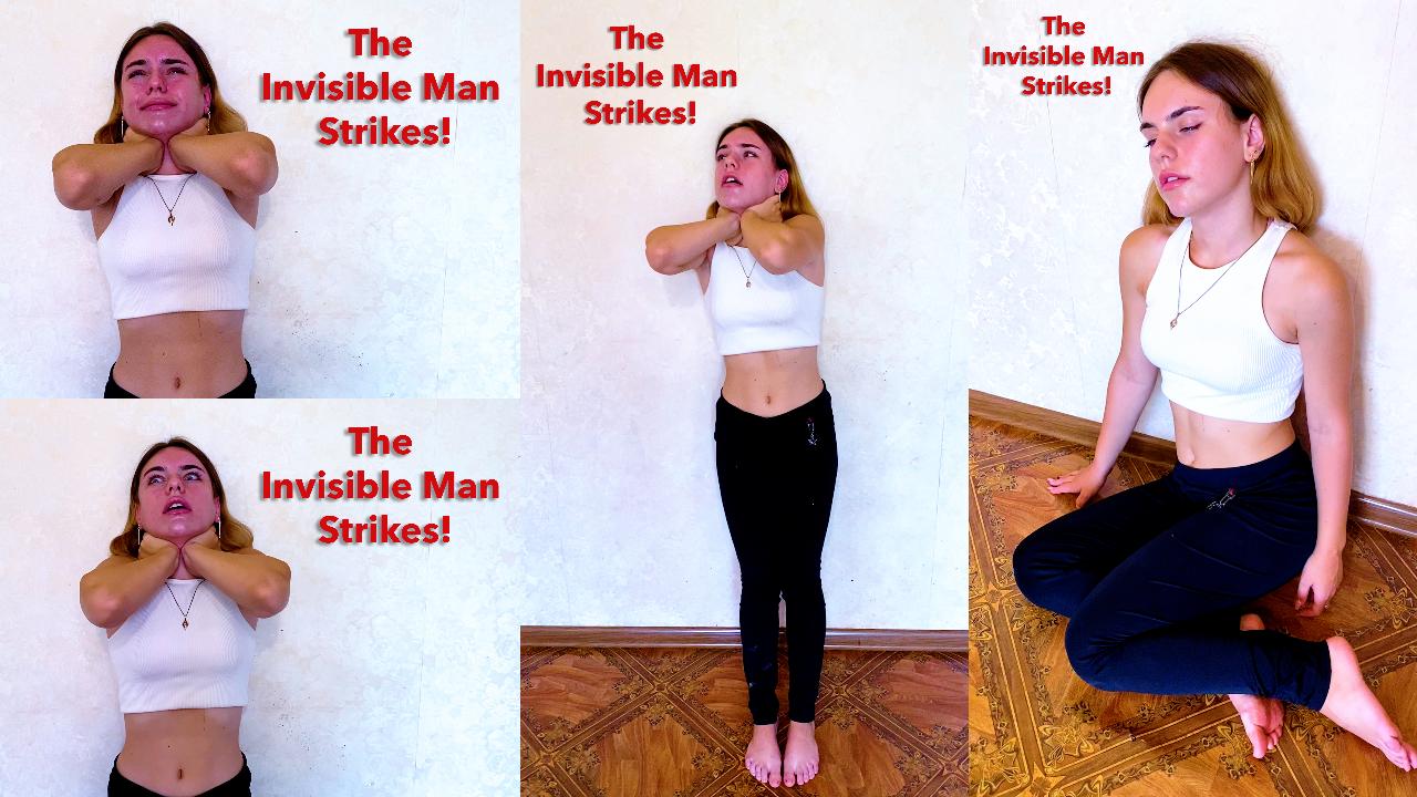Sasha stands against the wall in fear, her hands taken over by the Invisible Strangler! The hands wrap around her throat, pressure exerting hard on her carotid artery. Sasha chokes in place, the pressure causing her face to grow bright red. She gasps in fear, trying to catch some air as the pressure becomes more and more painful. Eyes wide, she tries to shake her way free but the Strangler has her held in place. Sasha is forced to squirm there in place as her red face grows darker, her vision slowly fading as she is strangled relentlessly. After her struggle gets weaker, she fades away and dies against the wall. Sasha falls limply onto the floor, crumpled there with here eyes partway open.