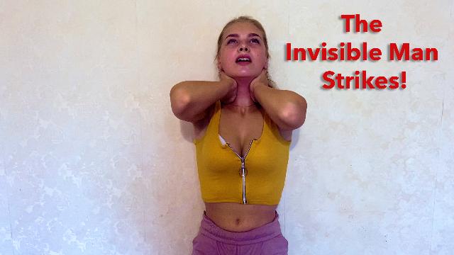 Megan is held up against the wall under the power of the Invisible Strangler. Her hands press hard on either side of her neck, forcing Megan to choke herself. Her face gets red as she struggles and the hands constrict her arteries. She squirms against the wall, mouthing opening in pain and eyes wide in fear. She shuffles her feet and shakes her legs but is unable to put up much of a fight. After choking her a while, the Invisible Strangler leans in close and unzips Megan’s crop top, exposing her bra while the hands strangle her relentlessly. She shakes and squirms in place against the wall while she is choked out. The pressure is just enough to ensure the victim submits but also makes the struggle last as long as possible. There is no hope for Megan at the mercy of the Invisible Strangler. After a time she perishes, sliding limp to the ground dead with her eyes open.